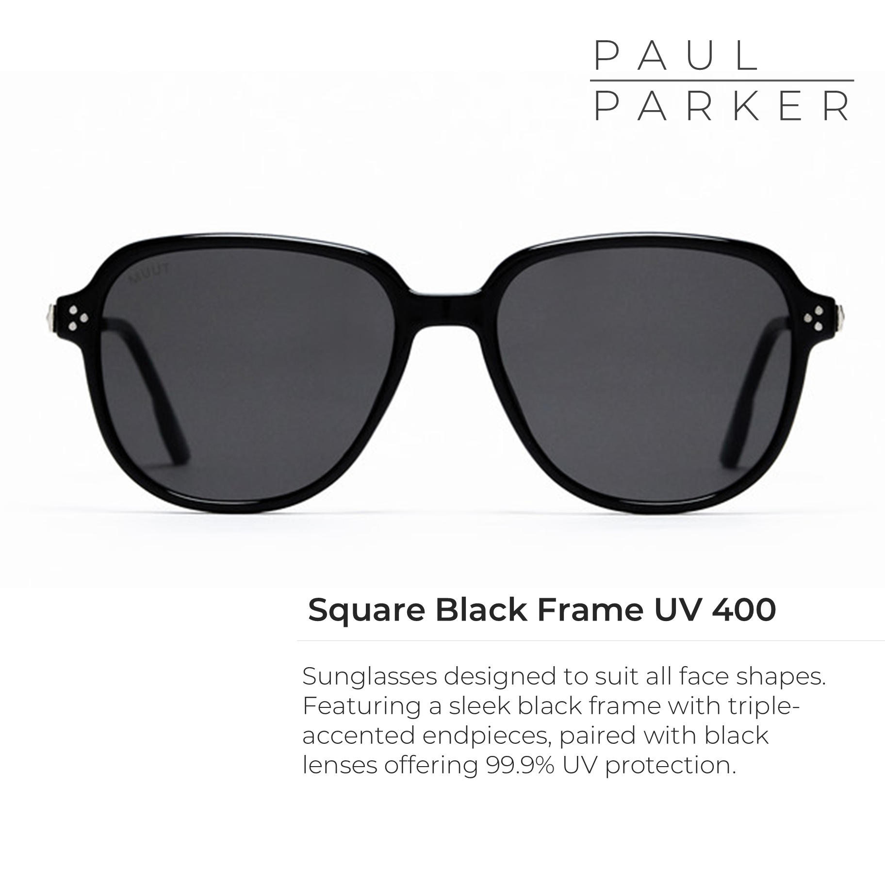 Paul Parker Square Black Frame UV 400 – Sunglasses Stylish Trend 2025. Paul Parker presents premium sunglasses with a bold & elegant design, suitable for all face shapes. Crafted with a stylish black square frame, and an end-piece decorated with three iconic points, these sunglasses provide an alluring modern look.
